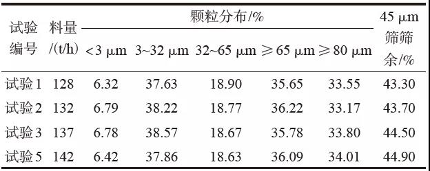 從表3和表4比較可知,四種試驗運行情況下,試驗原始物料配比不變,熟料粒度差別不大的情況下,隨著投料量的增加,出V型選粉機微粉總體變粗。