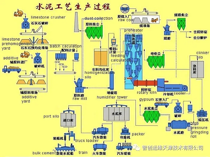 4.生產(chǎn)工藝:硅酸鹽水泥生產(chǎn)的大體步驟是:先把幾種原材料按適當(dāng)?shù)谋壤浜虾煤笤谀C(jī)中磨成生料;然后將制得的生料入窯進(jìn)行煅燒;再把燒好的熟料配以適當(dāng)?shù)氖啵ê突旌喜牧希┰谀C(jī)中磨成細(xì)粉,即得水泥。硅酸鹽系水泥的生產(chǎn)概括起來(lái)就是“兩磨一燒”。生料制備:石灰質(zhì)原料,粘土質(zhì)原料與少量校正原料經(jīng)破碎后,按一定比例配合、磨細(xì),并配合為成分合適,質(zhì)量均勻的生料熟料煅燒:生料在水泥窯內(nèi)煅燒至部分熔融所得以硅酸鈣為主要成分的硅酸鹽水泥熟料水泥粉磨:熟料加適量石膏,有時(shí)還加適量混合材料或外加劑共同磨細(xì)為水泥生產(chǎn)方法①干法生產(chǎn) 將原料同時(shí)烘干并粉磨,或先烘干經(jīng)粉磨成生料粉后喂入干法窯內(nèi)煅燒成熟料的方法。但也有將生料粉加入適量水制成生料球,送入立波爾窯內(nèi)煅燒成熟料的方法,稱之為半干法,仍屬干法生產(chǎn)之一種。②濕法生產(chǎn) 將原料加水粉磨成生料漿后,喂入濕法窯煅燒成熟料的方法。也有將濕法制備的生料漿脫水后,制成生料塊入窯煅燒成熟料的方法,稱為半濕法,仍屬濕法生產(chǎn)之一種。 干法和濕法生產(chǎn)特點(diǎn)①干法生產(chǎn)特點(diǎn):干法是將生料粉直接送入窯內(nèi)煅燒,入窯生料的含水率一般僅1%~2%,省去了烘干生料所需的大量熱量。不僅可以制備出質(zhì)量均勻的生料而且逐步向大型方向發(fā)展。現(xiàn)在將懸浮預(yù)熱和預(yù)分解窯統(tǒng)稱為新型干法窯,它們成為干法生產(chǎn)今后發(fā)展的方向。②濕法生產(chǎn)特點(diǎn):將生料制成含水32%一36%的料漿,在回轉(zhuǎn)窯內(nèi)將生料漿烘干并燒成熟料。濕法制備料漿,粉磨能耗較低,約低30%,料漿容易混勻,生料成分穩(wěn)定,有利于燒出高質(zhì)量的熟料。但球磨機(jī)易磨件的鋼材消耗大,熟料出窯溫度較低,不宜燒高硅酸率和高鋁氧率的熟料。